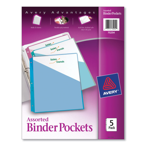 Binder Pockets, 3-Hole Punched, 9.25 x 11, Assorted Colors, 5/Pack