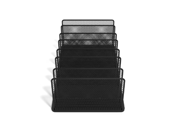 Keep important files within arm's reach using this TRU RED™ matte black mesh horizontal file organizer. Create a streamlined desktop filing system with this horizontal file organizer. Seven open compartments provide easy access to documents, file folders and mail, while the tightly woven mesh pattern adds both durability and modern style. This desk organizer features flat square-rounded edges and a matte black finish for a professional appearance. Boasting nonslip feet, this TRU RED™ black mesh horizontal file organizer prevents slipping and scratching.
